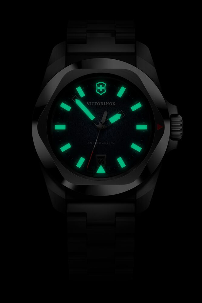 Un tributo moderno al legado de la Swiss Army Knife™: este reloj fusiona historia y vanguardia con una esencia propia de diseño. El reloj I.N.O.X. Cuarzo, diseñado y fabricado en Suiza, combina la precisión con la funcionalidad cotidiana. Presenta una esfera mate con índices en relieve y manecillas luminosas que facilitan la lectura de día y de noche, además de un indicador de fecha a las 6. El bisel cepillado y pulido con tratamiento antirrayaduras añade refinamiento, mientras que el sistema de correa de caucho intercambiable asegura un uso versátil y cómodo.