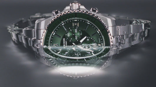 • Reloj inspirado en el buceo con bisel giratorio unidireccional, cacha de cuenta ascendente y funciones de cronógrafo y taquímetro